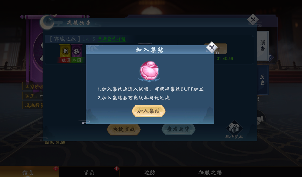满足以上几个条件便能够成功宣战了。别忘了,在国家-战争-界面中点击集结,还可获得集结buff加成。