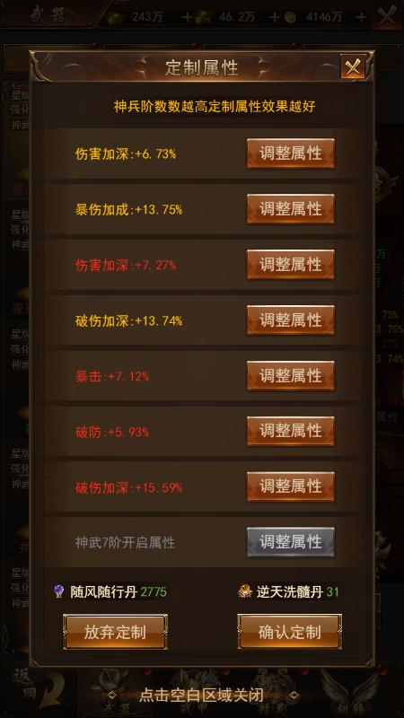 二、每件神兵定制属性不同于洗练的随机性,定制可根据玩家个性化定制所需的属性。
