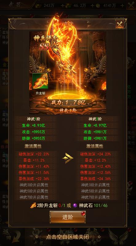 4.神兵还可以通过不同品质道具进行升星或神武进阶,升星与进阶能够提供大量的战斗力加成,小伙伴们一定不要错过。