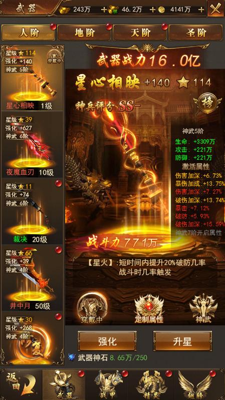 5.每种不同的神兵提供的属性也不相同,但属性都可叠加,越稀有的神兵提供的战斗力也越高。