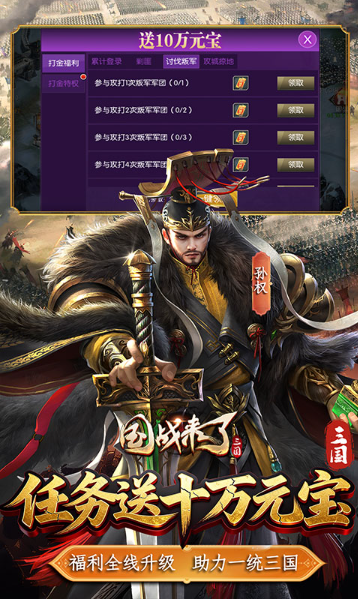 《国战来了(0.1 折权倾天下)》以其超低的折扣、海量的福利、创新的玩法和公平的竞技环境,为玩家们呈现了一个真实而又精彩的三国世界。在这里,你可以尽情享受策略博弈的乐趣,体验征战四方的豪情,收获实实在在的福利。快来加入我们,一起开启这场震撼人心的三国争霸之旅吧!