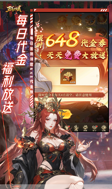 天天送 648:每日登录游戏,大额代金券便如雪花般纷纷落入你的囊中。这些代金券如同加速的引擎,让你的三国霸业之路一路疾驰,快速积累资源,提升实力,在乱世中迅速崭露头角。