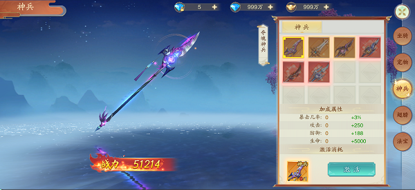 神兵化形,进入神兵属性界面,我们可以看到,神兵也是有很多种类的,品质也有高低,品质越高的神兵基础属性也越高哦,激活神兵来获得更高的加成属性吧!